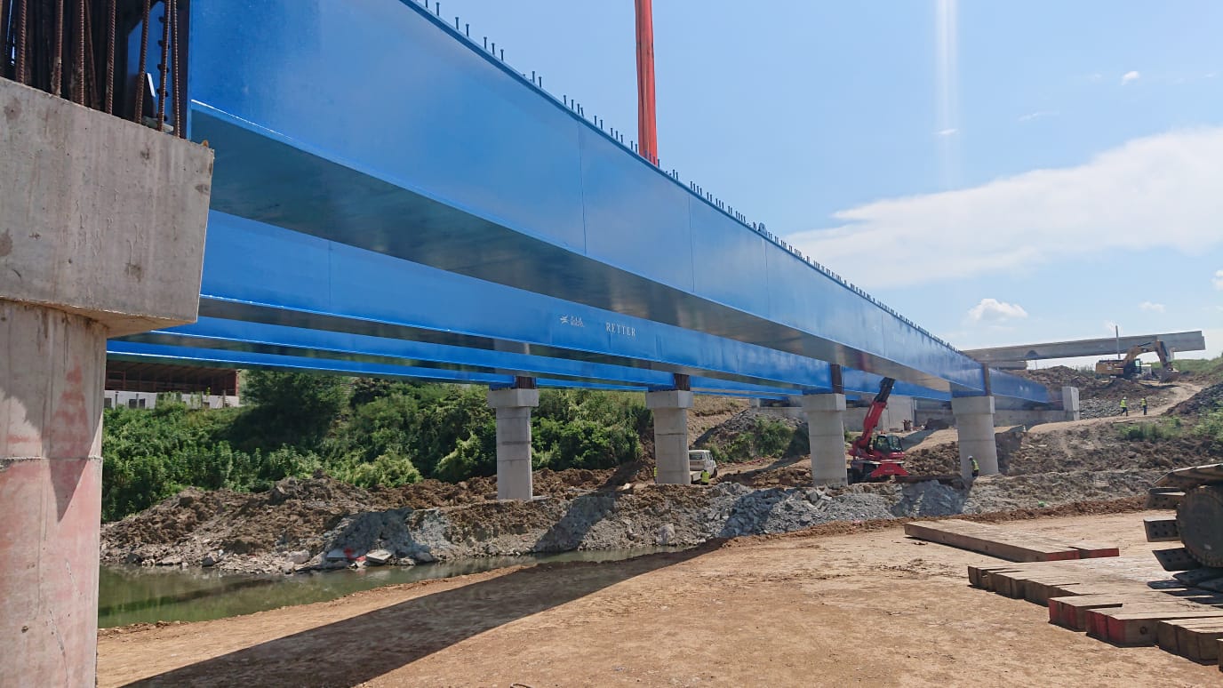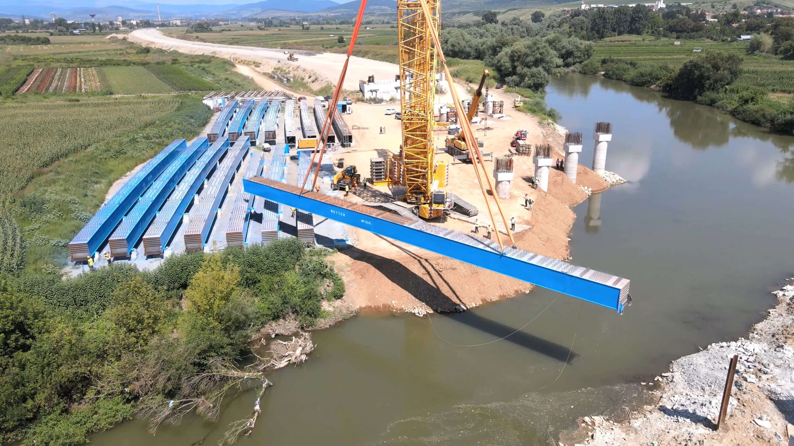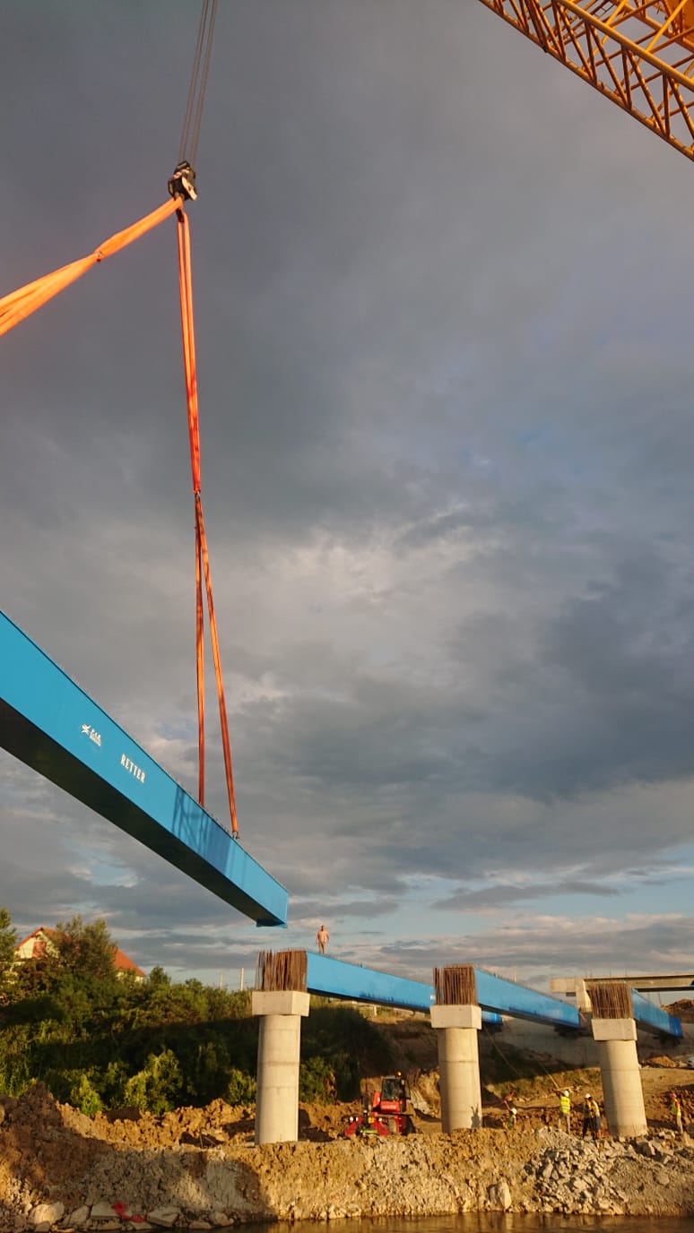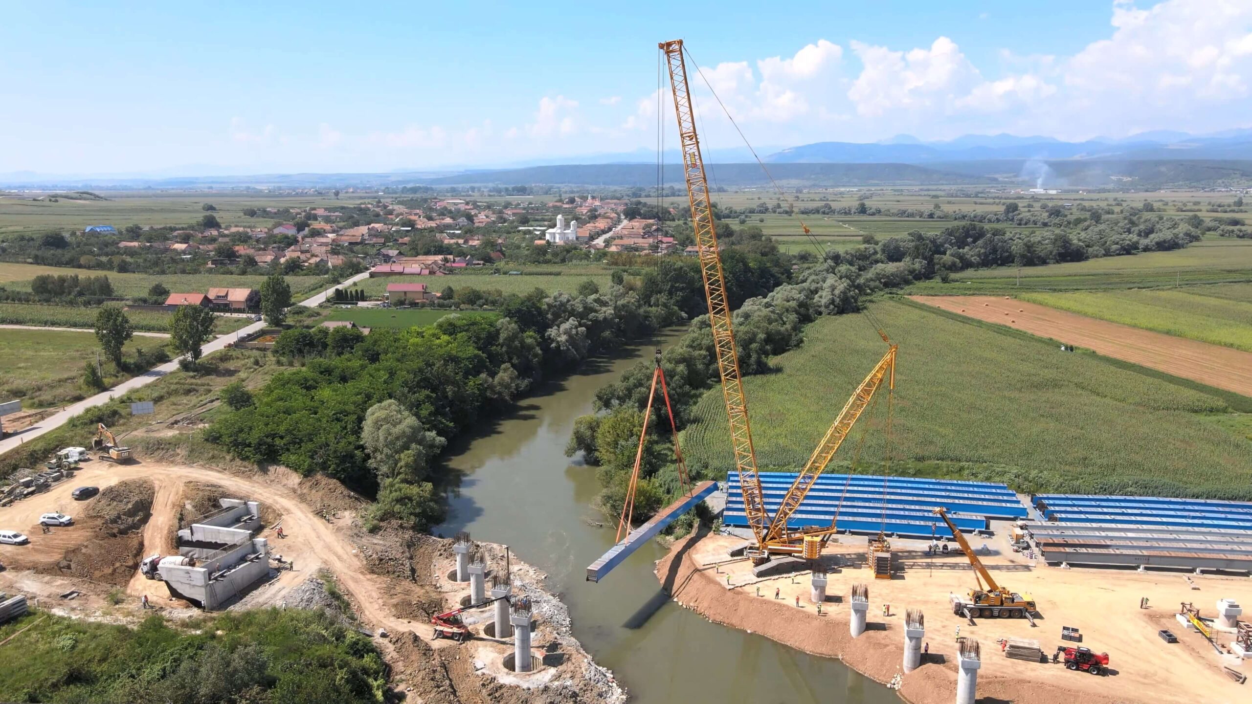 Die Stunde der „Metallmonster“ geht weiter mit dem Anheben der Stahlträger an der Struktur, die den Fluss Mureș von Sâncrai überqueren wird. Eine Besonderheit dieser Brücke ist die Tatsache, dass sie in einer Kurve gebaut ist, sodass die Säulen und Träger speziell dafür entworfen wurden.