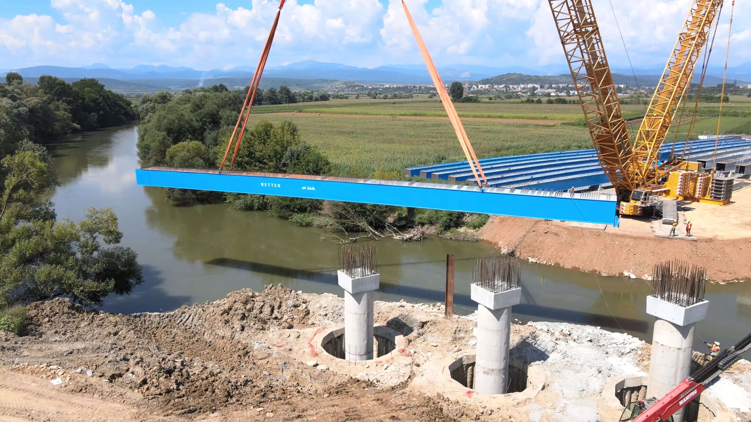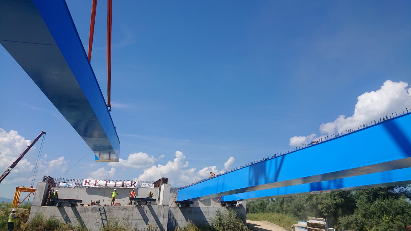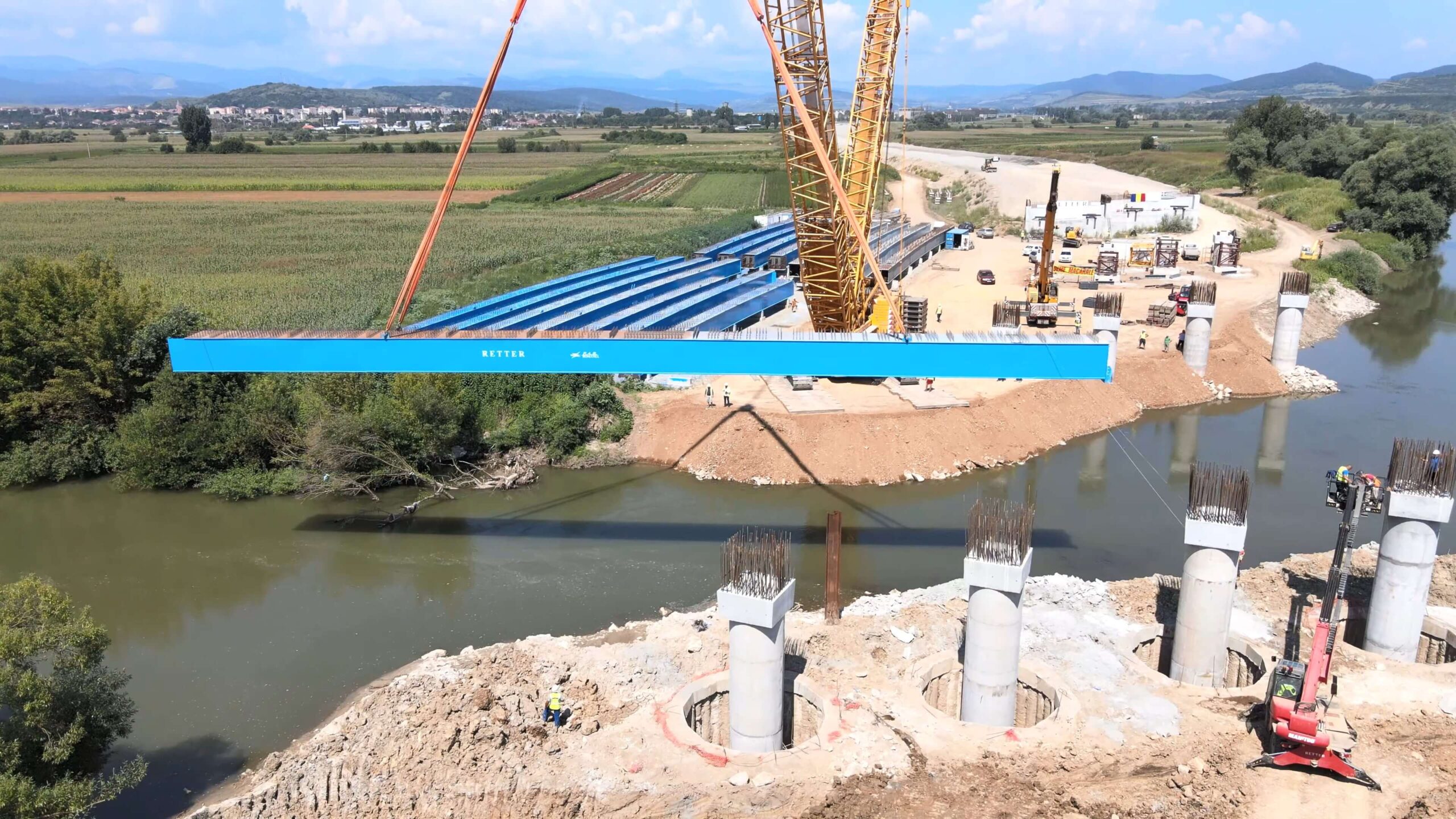 Die Stunde der „Metallmonster“ geht weiter mit dem Anheben der Stahlträger an der Struktur, die den Fluss Mureș von Sâncrai überqueren wird. Eine Besonderheit dieser Brücke ist die Tatsache, dass sie in einer Kurve gebaut ist, sodass die Säulen und Träger speziell dafür entworfen wurden.