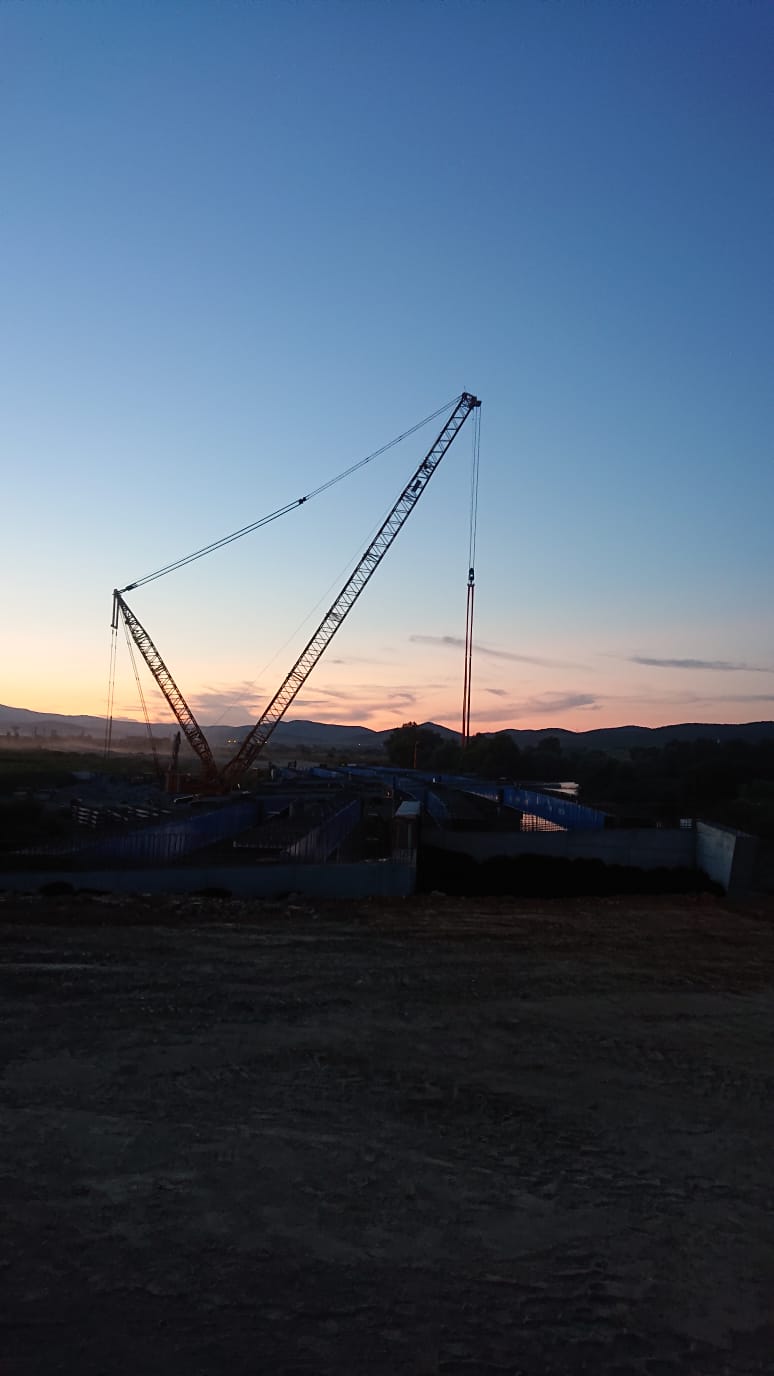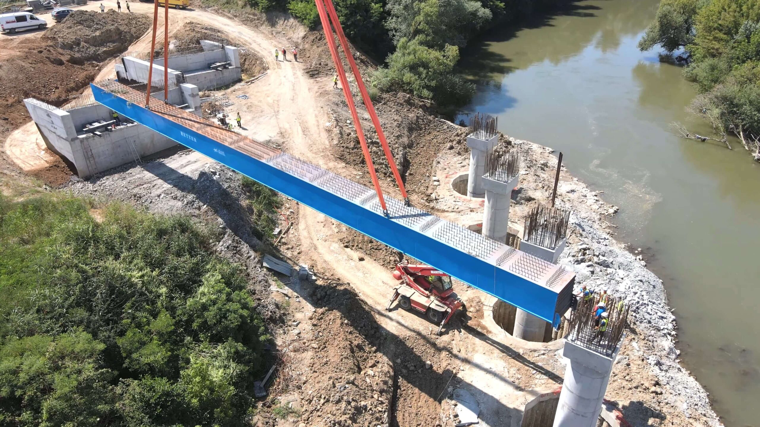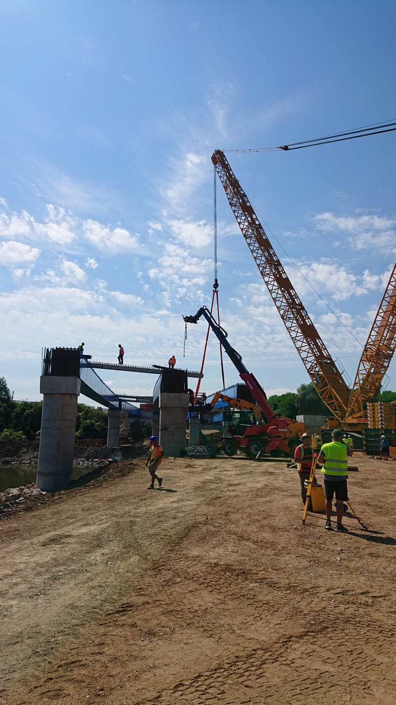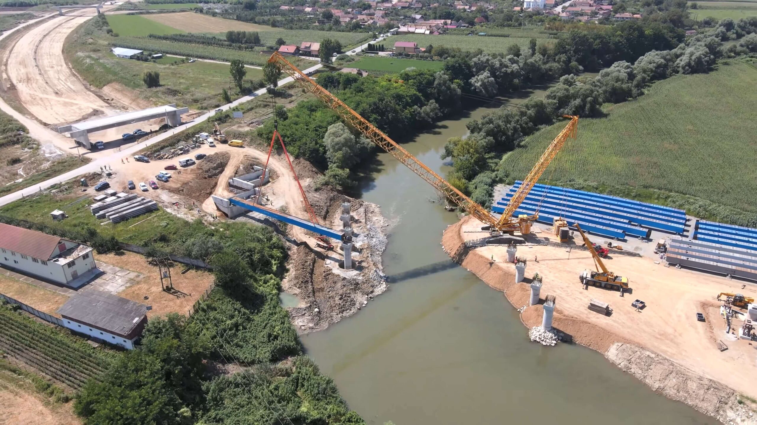 Die Stunde der „Metallmonster“ geht weiter mit dem Anheben der Stahlträger an der Struktur, die den Fluss Mureș von Sâncrai überqueren wird. Eine Besonderheit dieser Brücke ist die Tatsache, dass sie in einer Kurve gebaut ist, sodass die Säulen und Träger speziell dafür entworfen wurden.